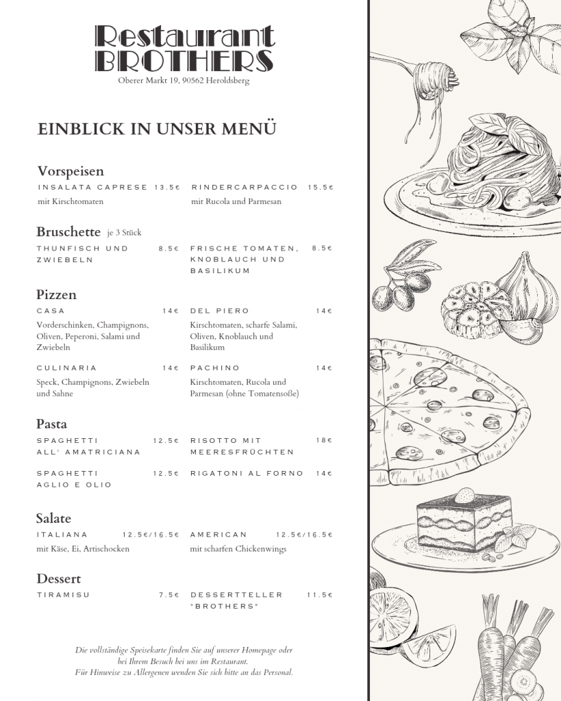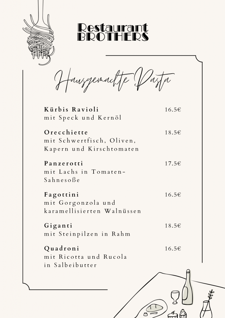 Rund 70 Gäste finden im „Brothers“ Platz und können sich in stilvollem Ambiente mit typisch italienischen frisch zubereiteten Gerichten und außergewöhnlichen Weinen verwöhnen lassen.